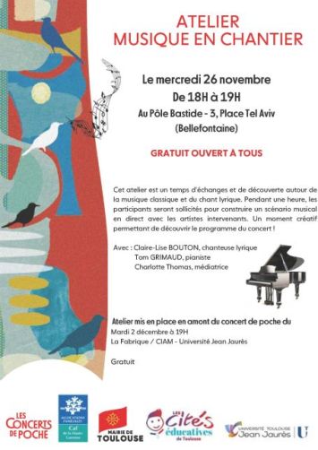 Pôle Associatif Bastide 3 place de Tel Aviv, ToulouseLes Concerts de Poche vous invitent le mercredi 26 novembre, de 18h à 19h, à son Atelier Musique en Chantier ! Gratuit et ouvert à tous dès six ans ! Venez rencontrer et travailler aux côtés de la chanteuse lyrique Claire-Lise Bouton et du pianiste Tom Grimaud pour préparer le grand concert de poche du 2 décembre. Une immersion inédite et interactive dans l'univers de la musique classique vous attend !