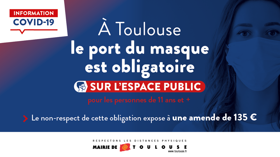 Au regard de l’évolution de la situation sanitaire dans l’agglomération toulousaine, le port du masque est désormais obligatoire sur la voie publique et dans les lieux ouverts au public à Toulouse et dans certains lieux ouverts au public dans le département de la Haute-Garonne.